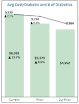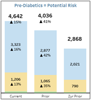 For McGohan Brabender clients, the average cost per diabetic patient for costs associated directly with diabetes, and not including co-morbidities, was $6,088. This is an increase of 13% in cost per patient from the prior 12-month period. There were 2.2% more members diagnosed with diabetes from the prior period, for a total of more than 9,900 members. This equates to 8% of the population diagnosed with diabetes. Additionally, there were more than 4,600 members diagnosed with pre-diabetes, up 15% from the prior period.